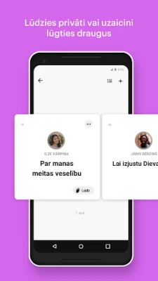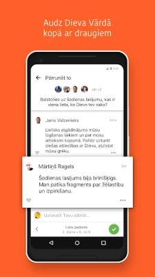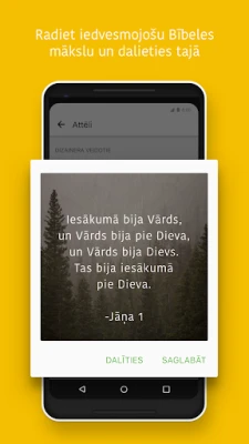 YouVersion Bībeles lietotne veicina dziļāku saikni ar Dievu un citiem ticīgajiem. Veidojiet personalizētus lūgšanu sarakstus, kas palīdzēs jums mērķtiecīgi lūgt un atcerēties atbildētās lūgšanas. Dalīties ticības ceļojumā ar draugiem ir vienkārši – apmainieties ar idejām, uzdodiet jautājumus un kopīgi studējiet Rakstus, izmantojot kopīgās lasīšanas plānus. Izveidojiet iedvesmojošus Bībeles pantu attēlus vai pievienojiet pantus saviem fotoattēliem, lai viegli dalītos Dieva Vārda patiesībās sociālajos tīklos, e-pastā vai SMS. Sazinieties ar draugiem un sekojiet līdzi viņu atklājumiem sākumlapā, veidojot spēcīgu kopienu ap Rakstiem.