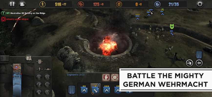 Sagatavojies iegrimt Otrā pasaules kara Eiropas frontes sirdī ar "Company of Heroes" – izcilāko reāllaika stratēģijas pieredzi, kas meistarīgi pielāgota Android ierīcēm. Vadi divas drosmīgas amerikāņu karavīru vienības, sākot ar vēsturisko D-dienas desantu Normandijā, un stājies pretī nepielūdzamajam pretiniekam. Ar intuitīvu lietotāja saskarni un zibensātrām vadības iespējām, "Company of Heroes" sniedz iespēju izpildīt sarežģītas taktikas kaujas karstumā, padarot katru lēmumu kritiski svarīgu.