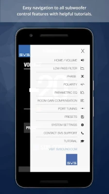 Ar SVS lietotni jūs varat viegli optimizēt iestatījumus, piemēram: skaļuma kontroli, zemfrekvences filtru, fāzi, polaritāti, parametrisko EQ, telpas pastiprinājuma kompensāciju, porta regulēšanu (tikai portētajiem modeļiem), pielāgotus priekšiestatījumus, sistēmas iestatījumus un zemfrekvences skaļruņa priekšējo displeju (tikai 16-Ultra, 4000 sērijas un 3000 In-Wall modeļiem). Lietotne ir saderīga ar Android 8.0 vai jaunāku versiju. Tā ir pieejama arī SVS 13-Ultra pastiprinātāja jaunināšanas komplektiem esošajiem SVS SB13, PB13, PC13-Ultra, PB12-PLUS un PC12-PLUS zemfrekvences skaļruņu īpašniekiem. Ja jums ir jautājumi, problēmas vai atsauksmes, sazinieties ar mums pa e-pastu