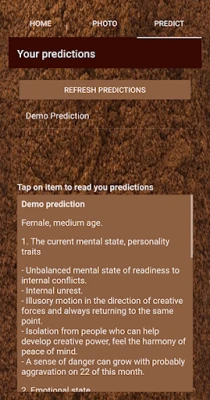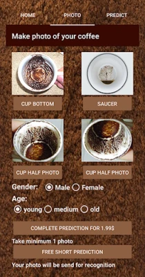 Lai uzsāktu savu zīlēšanas ceļojumu, process ir vienkāršs un intuitīvs. Vispirms izbaudiet savu kafiju. Kamēr dzerat, koncentrējieties uz jautājumu, kas jūs nodarbina, vai domu, ko vēlaties izpētīt. Pēc tam paņemiet tukšo krūzīti kreisajā rokā, apgrieziet to un uzmanīgi uzlejiet uz apakštasītes, ļaujot kafijas biezumiem dabiski sakārtoties. Kad tas izdarīts, dodieties uz lietotnes FOTO sadaļu, uzņemiet skaidru attēlu ar kafijas biezumu atstātajiem rakstiem. Pēc tam vienkārši nospiediet PREDICĒT, lai acumirklī saņemtu savu personalizēto prognozi.